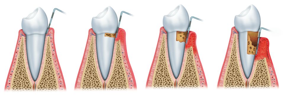 La periodontitis clínicamente presenta los signos de la gingivitis pero también se acompaña de la pérdida de los tejidos que soportan el diente: el ligamento periodontal y el hueso alveolar, causando la movilidad del diente y futura pérdida de éste si no se trata.